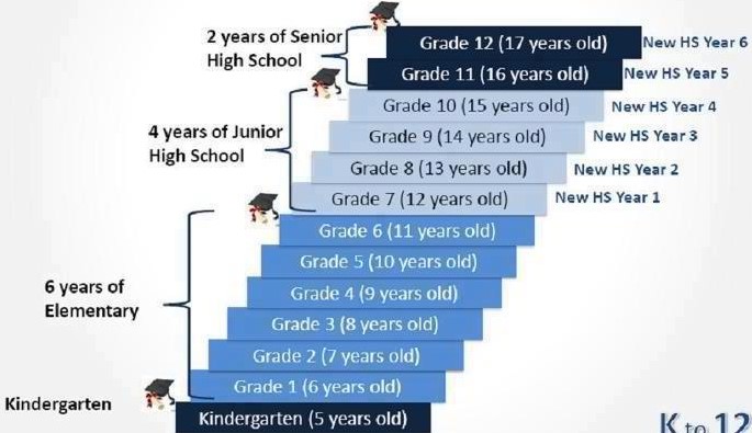 The Filipino student must study one year for Kindergarten, six years for primary education, four years for Junior High School, and two years for Senior High School. During this time, they provide sufficient time for mastery of concepts and skills, develop lifelong learners, and prepare graduates for tertiary education, middle-level skills development, employment, and entrepreneurship.